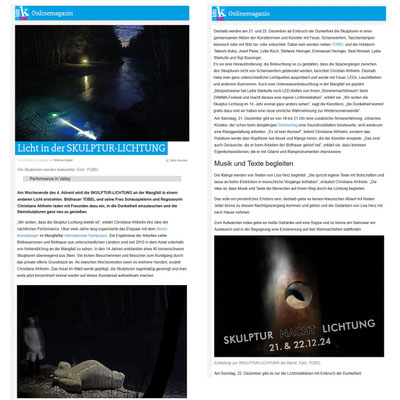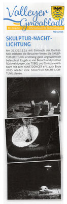 Auch dieses Jahr wird die SKULPTUR-LICHTUNG in einen Lichterzauber der besonderen Art verwandelt. Zusammen mit eingeladenen Künstlern, werden die mittlerweile rund 50 großen Skulpturen, ab Einbruch der Dunkelheit auf verschiedenste Weise illuminiert.